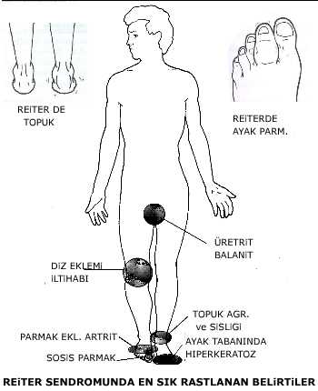 Belirtiler genellikle evlilik dışı cinsel ilişkiden sonra başlayan idrar ya da üreme yolu enfeksiyonlarından yada mide-bağırsak sorunlarından bir-dört hafta sonra ortaya çıkar. Diz, bilek yada ayaklardan biri ağrır yada şişer. Ateş ve kilo kaybına sık rastlanır. Kaburgalarda, sırtta, belde, topukta ve aşil tendonunda (topuk arkasındaki kalın kiriş) ağrı duyulabilir. Ayrıca gözlerde şişme ve kızarma, döküntü ve idrar yolu iltihabı gibi belirtiler sayılabilir. Bu hastalarda deri ve mukozaları tutan lezyonlar vardır. Ayak tabanında pullanmalar, hiperkeratoz, deride ağrılı nodüller, penis ve testislerde ülserasyonlar, ağızda aftlar sık görülür.