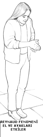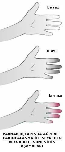 Reynaud fenomeni nöbetler halinde seyreder. Soğuk ve stres nöbetleri başlatan en önemli faktörlerdir. El ve ayak parmaklarında görülür. Parmak eklemleri önce soluklaşır, daha sonra morarır ve sonra tekrar normal rengine döner. Parmaklarda şiddetli ağrı ve üşüme vardır. Ağrı ve üşüme dakikalar ve saatler içinde geçer. Bazı romatizmal hastalıkların seyri esnasında daha sık görülür. Ancak hastalığın önemli bir kısmında hiçbir sebep bulunamaz. Nadirde olsa bazen ellerde yaralar açılabilir.